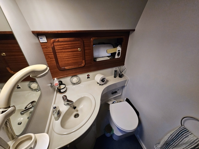 Designed with family cruising in mind, she features a spacious and well-thought-out interior layout. The generous aft cabin boasts a full island double berth with excellent storage, along with separate toilet and shower compartments for added comfort and privacy. Opposite the well-equipped galley, the dinette provides a comfortable dining space and easily converts into an additional double berth. Forward, the twin V-berth cabin benefits from ensuite access to the forward heads and shower, making her ideal for extended stays aboard or hosting guests.