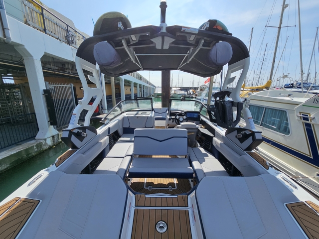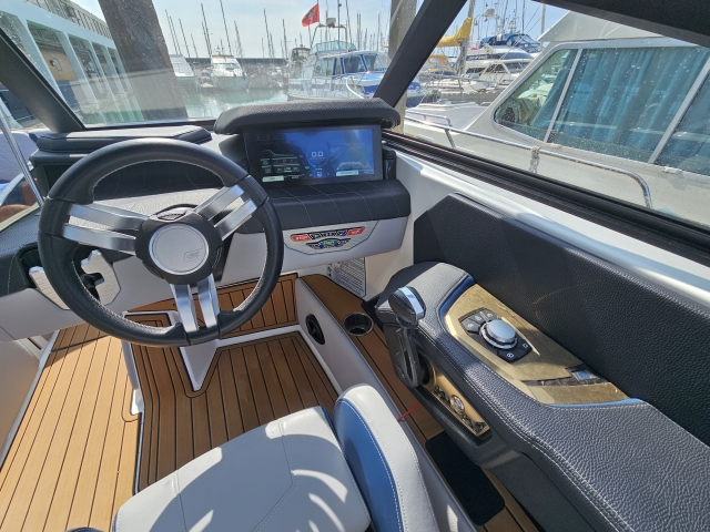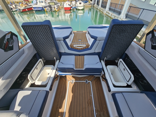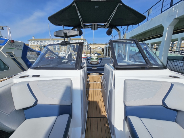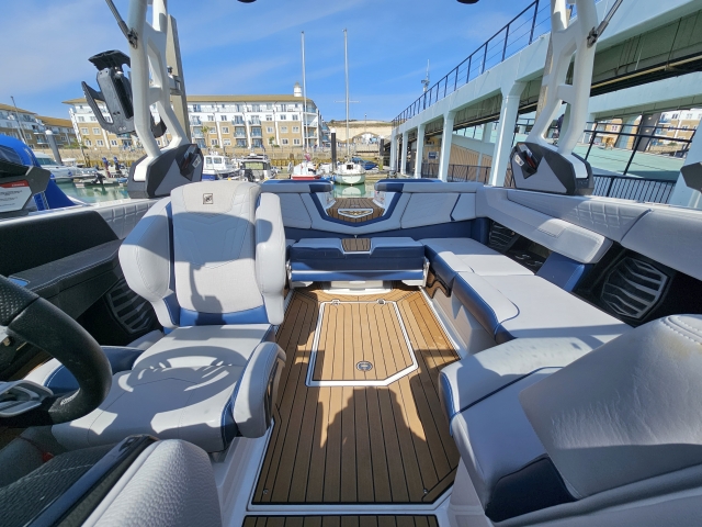 This particular G21 boasts a huge specification that sets it apart: premium Tower Speakers, Bimini top, Surf Select and Surf Switch — allowing riders to customize and control the wake and switch wave direction with ease. Add to that heated pilot and loveseat seats for those chilly UK mornings, and a Boatmate trailer that has never touched the water.