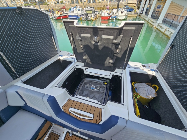 - Sliding reversible stern seats with flip-up lounge seat to port