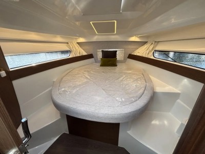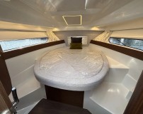 The specification includes a bowthruster for effortless manoeuvring, and a spacious cockpit featuring modular seating with a luxurious L-shaped arrangement and a full sun pad to the foredeck — perfect for relaxing or entertaining guests. Inside, the light and airy saloon benefits from panoramic windows, a fully equipped galley, a stylish and practical heads compartment, a forward double berth, and a generous mid cabin, making her ideal for extended stays aboard.
